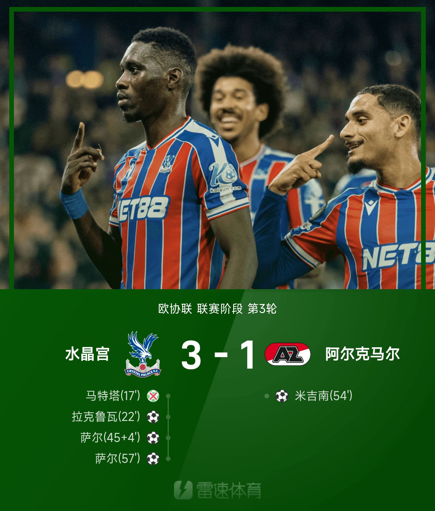 6686 ข่าวกีฬาวันที่ 7 พฤศจิกายน ในรอบที่สามของยูฟ่าแชมเปียนส์ลีก 25/26 คริสตัล พาเลซเอาชนะอัลค์มาร์ 3-1 ตลอดทั้งเกม ซาร์ยิงได้ 2 ประตู, ลาครัวซ์ยิงประตู, มิจินันยิงประตูแต่ไม่สามารถเซฟผู้รักษาประตูได้, มาเตต้าพลาดหนึ่งแต้ม, โอดูโร่เซฟแต้มเองหลังจากส่งแต้ม และมีส่วนช่วย 4 เซฟในเกมเดียว